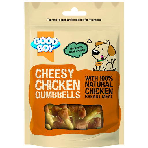 Good BoyGood Boy Cheesy Chicken Dumbbells are made with 100% natural chicken breast meat.Rawhide free recipe.Made with real cheese and loved by all dogs.Lo...