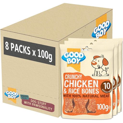 Good BoyGood Boy Crunchy Chicken And Rice Bones are made with 100% natural chicken breast meat.Case contains 8 x 100g packs.These tasty treats are ideal fo...