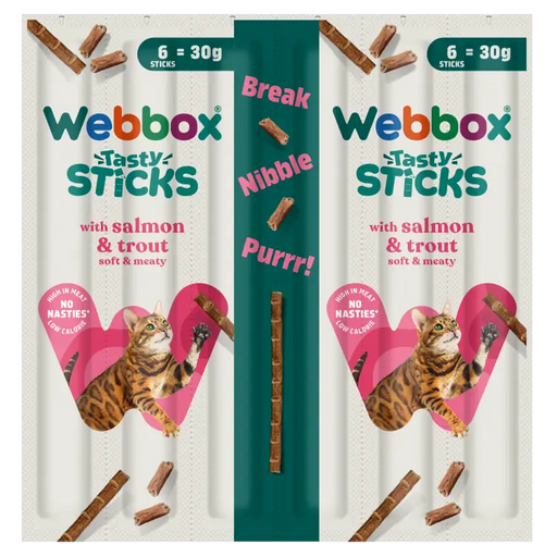 WebboxWebbox Cat Tasty Sticks with salmon and trout are suitable for cats and kittens over 3 months.These tasty treats are wheat and grain free.Developed...